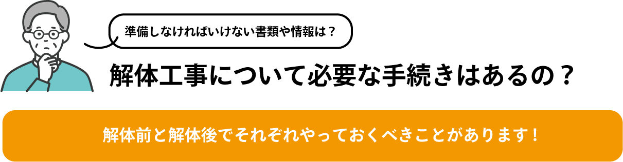 解体工事を始める前に、施主様から電線や水道、ガス管などのライフラインを撤去するための連絡を、それぞれの契約先に行う必要があります。手続きが着工前に完了していないと、工事が開始できないことがあるので気をつけてください。